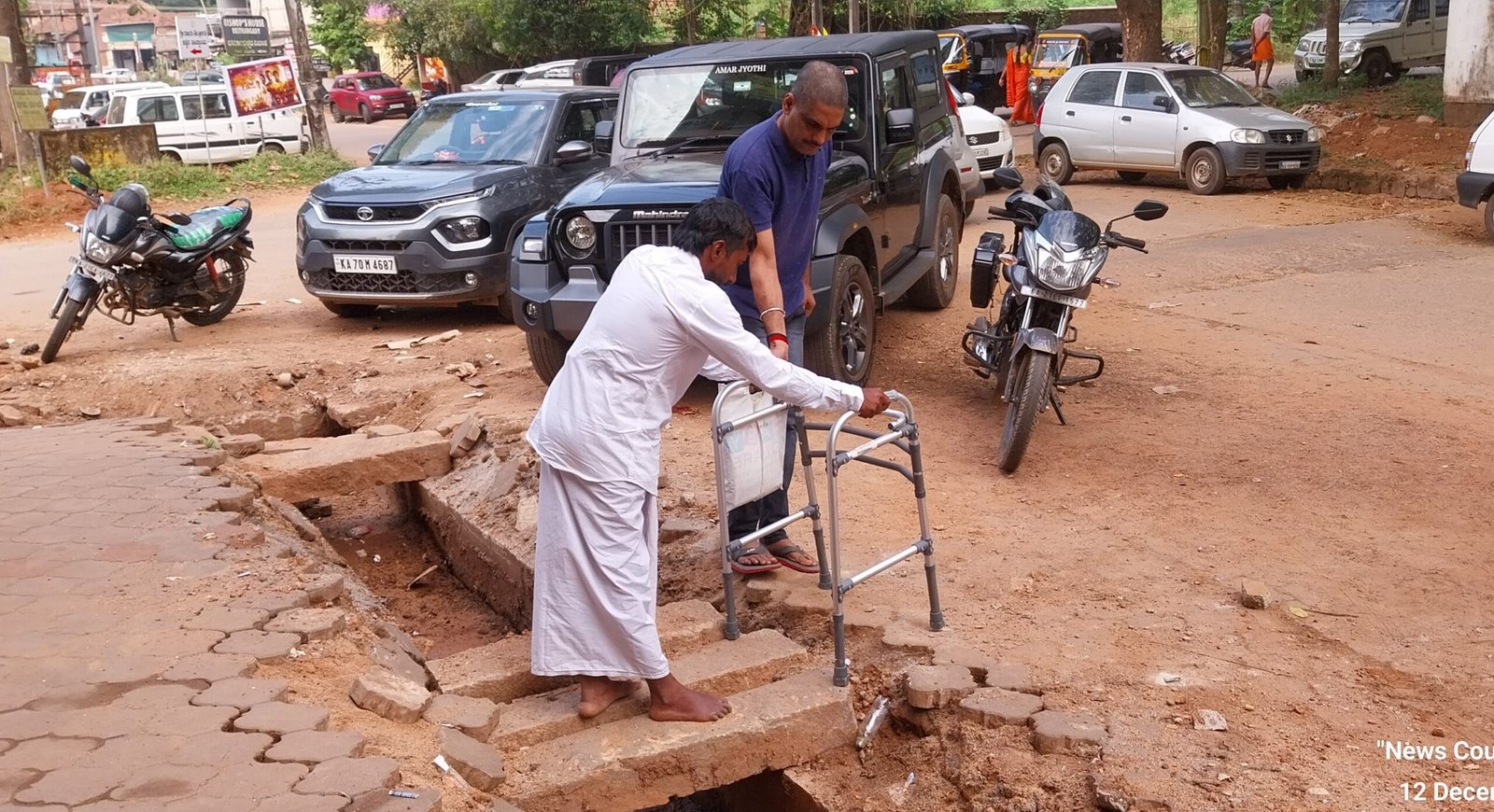 ವಾಕರ್ ನಲ್ಲಿ ಚರಂಡಿ ದಾಟಲು ಪರದಾಡಿದ ವಿಕಲಚೇತನ !